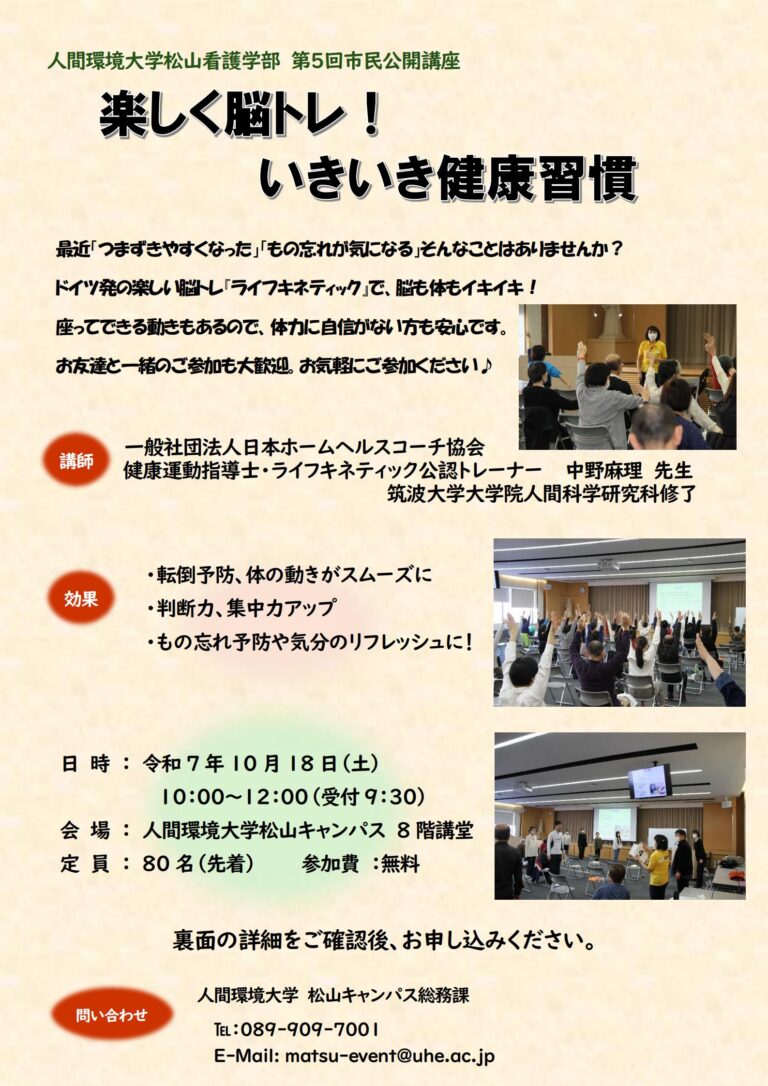 花園町通りの「人間環境大学松山キャンパス」にて、市民公開講座が開催されます。 講師 一般社団法人日本 […] -